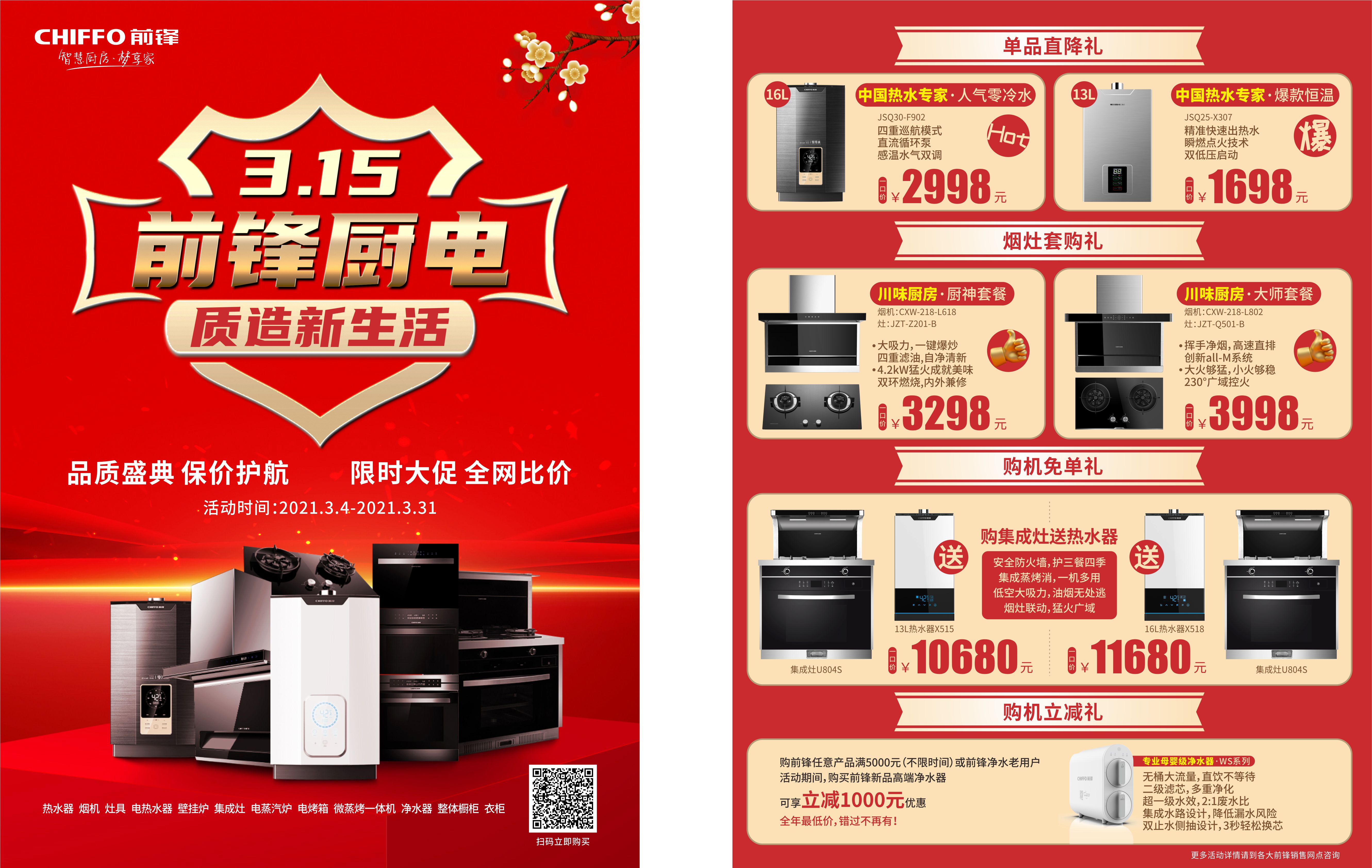 購買前鋒人氣爆款熱水器享現(xiàn)金直降;精選川味廚房煙灶套餐,給您的廚房裝備絕佳利器;購買指定蒸烤消多功能集成灶機型,立贈人氣熱水器一臺,同時還有針對凈水器用戶推出的購新機及換新用戶直減千元優(yōu)惠大活動……